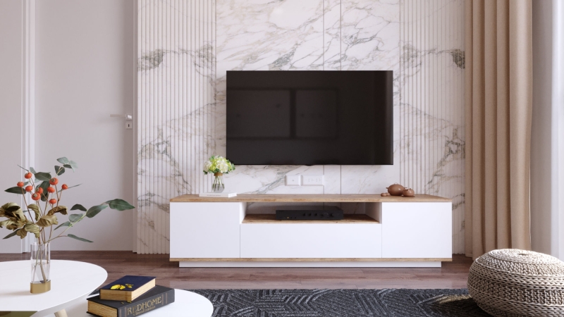 Televízny stolík AIWA je zložený z troch úložných priestorov s výklopnými dvierkami v bielom prevedení, korpus stola je v dekore borovice atlantic a bielej. Nad prostredným priestorom sa nachádza otvorená polička na dekoráciu alebo elektroniku. Stolík je vyrobený v jednoduchom, minimalistickom štýle z kvalitných, odolných materiálov, ktoré sa dobre udržujú. Materiál: melamínom potiahnutá drevotrieska Hrúbka: 18 mm Šírka: 180 cm