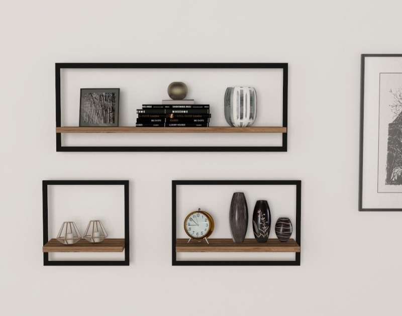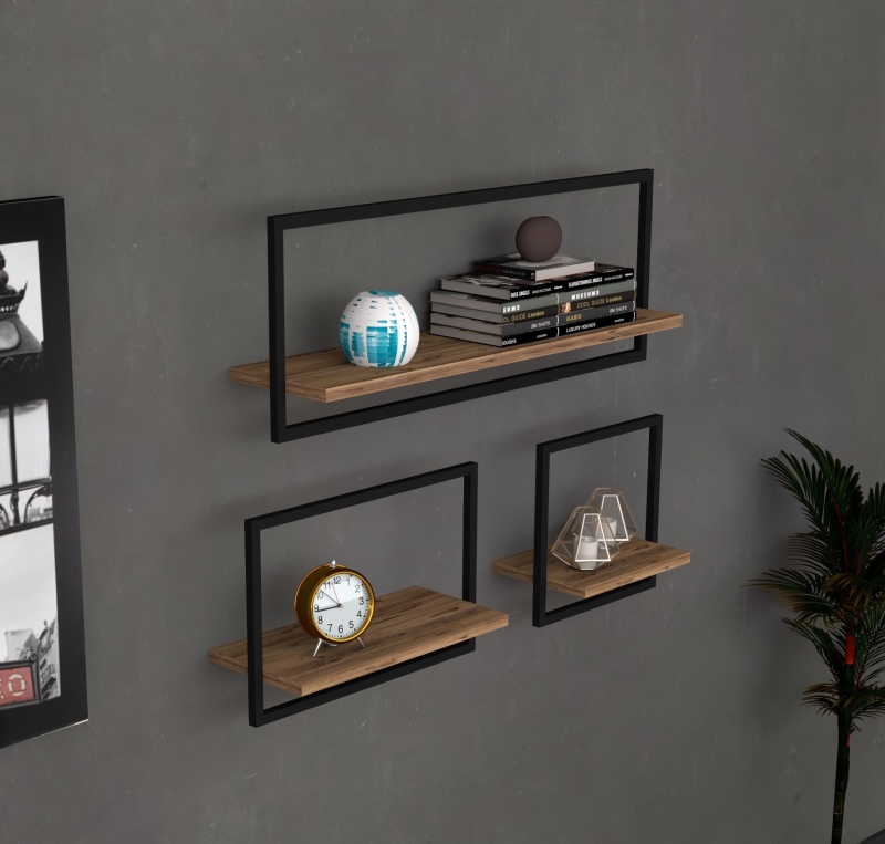 Tri nástenné police s hranatou kovou konštrukciou a poličkou v dekore borovice atlantic.