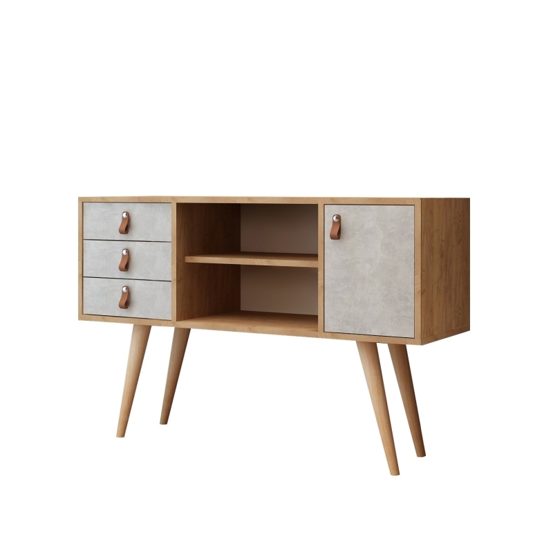 Elegantná skrinka INDIRA vyrobená v dizajne dreva dub s bielou ponúka tri zásuvky, dve poličky a úložný priestor s klasickými dvierkami.