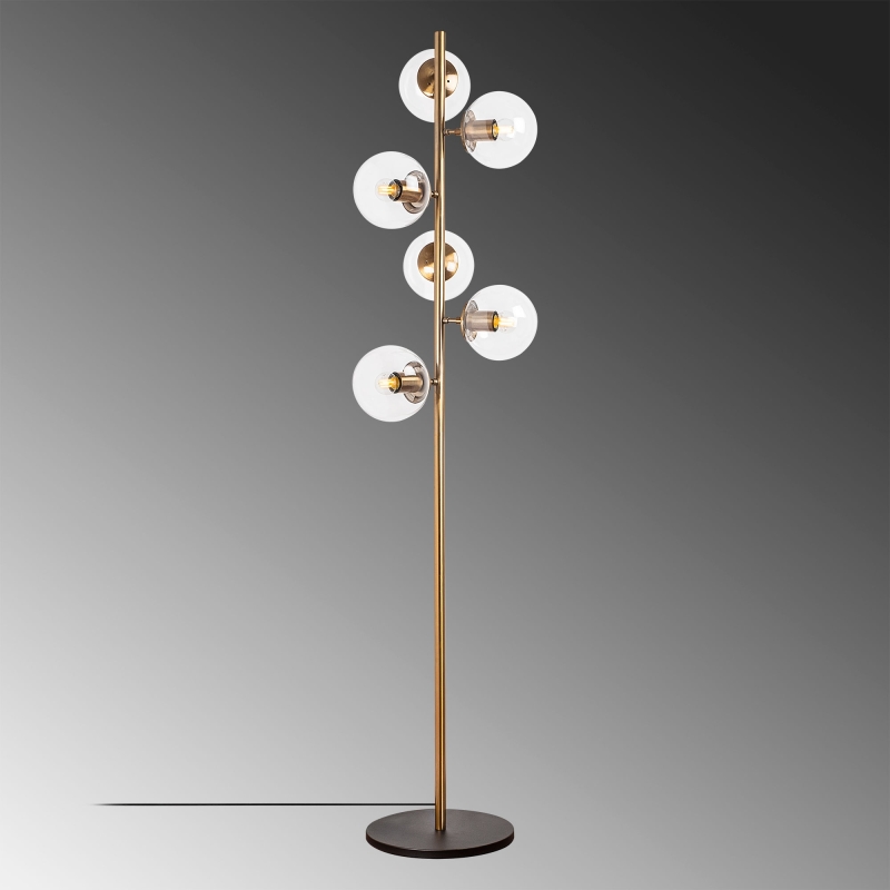 Kovové telo, sklenené svietidlá. Kovová základňa. Priemer tienidla: 15 cm (6 kusov) Rozmery: 35 x 22 x 163 cm Priemer základovej dosky: 30 cm Výška základovej dosky: 3 cm Tlačidlo zapnutia/vypnutia na kábli Ochrana IP20 Typ žiarovky: