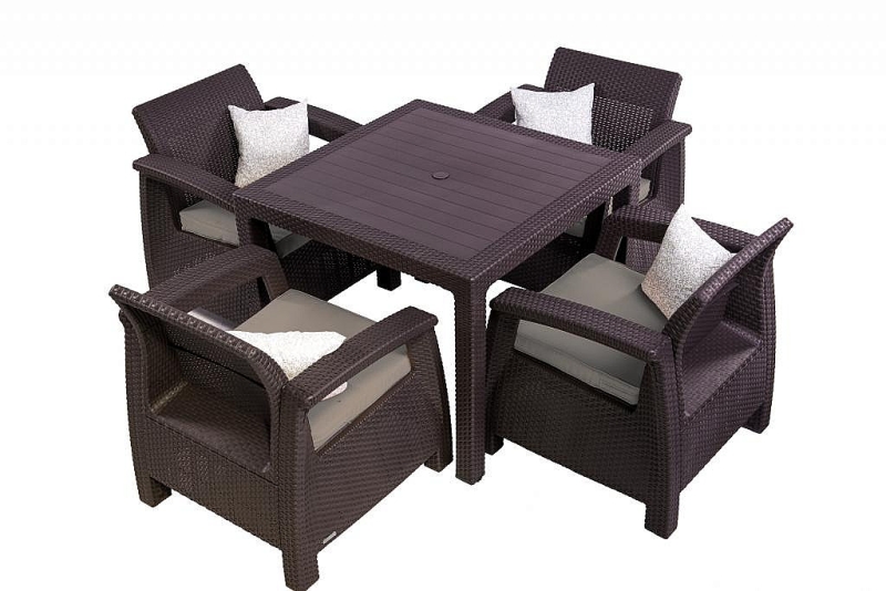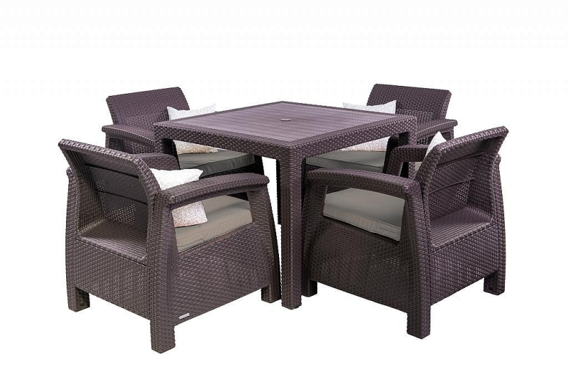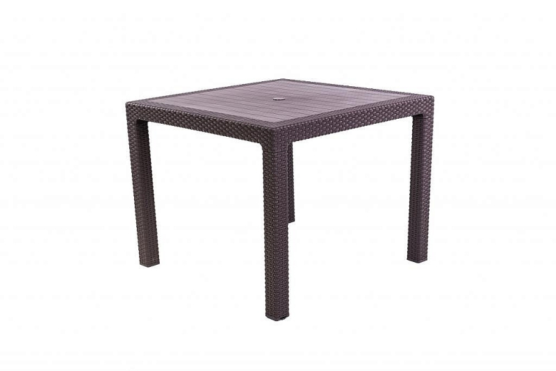 Stôl kombinácia tvrdý plast a umelý ratan. Sestava obsahuje: 1x Záhradný stôl z umelého ratanu MANHATTAN 95x95 cm (hnedá), 2x Záhradná ratanová zostava CORFU DUO (hnedá)