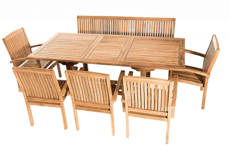 Aj napriek tomu sa jedná o odolný prírodný materiál, odporúčame nábytok raz ročne impregnovať teakovým olejom (viď príslušenstvo). Sestava obsahuje: 1x Záhradný obdĺžnikový stôl MONTANA 160/210 x 90 cm (teak), 1x Záhradná teaková lavica HARMONY 180 cm, 5x Záhradné pevné kreslo HARMONY (teak)