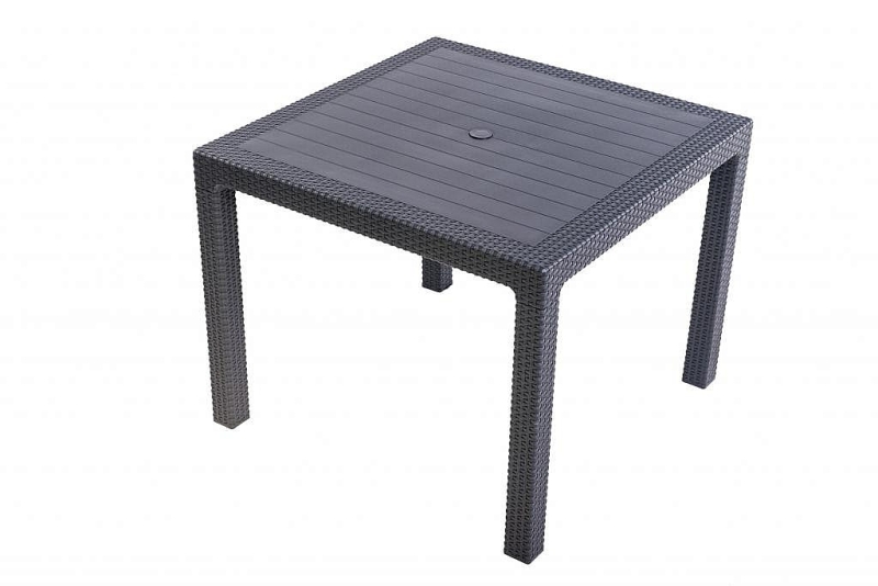 Konštrukcia odolává výkyvom počasia, poveternostným podmienkam, vode i UV žiareniu Sestava obsahuje: 4x Záhradná plastová stolička KARA (antracit), 1x Záhradný stôl z umelého ratanu MANHATTAN 95x95 cm (antracit)
