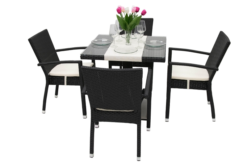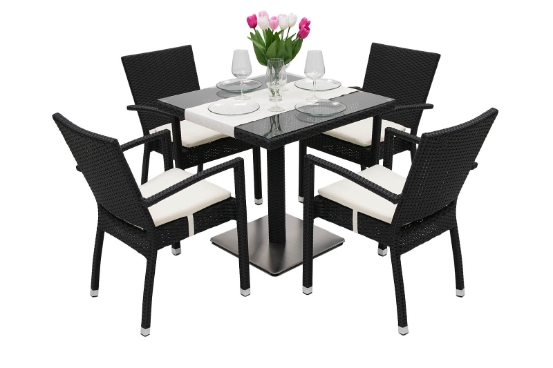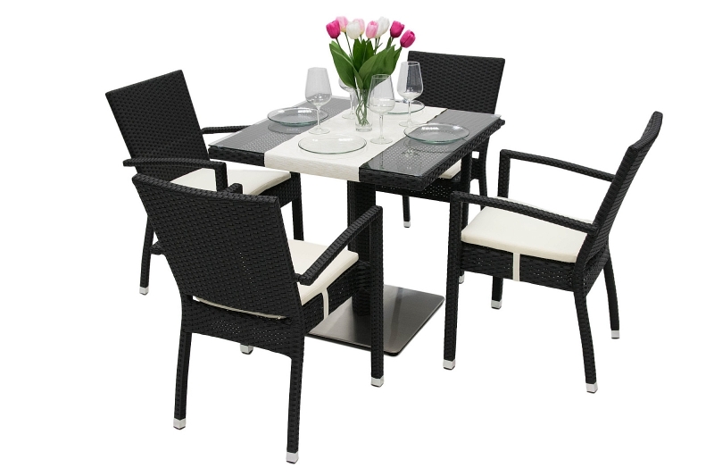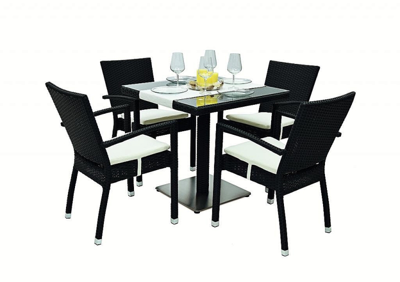 Jednoduchá údržba, elegantný vzhľad. Sestava obsahuje: 1x Záhradný ratanový stôl GINA 80x80 cm (čierna), 4x Záhradné ratanové kreslo NAPOLI s poduškou (čierna)