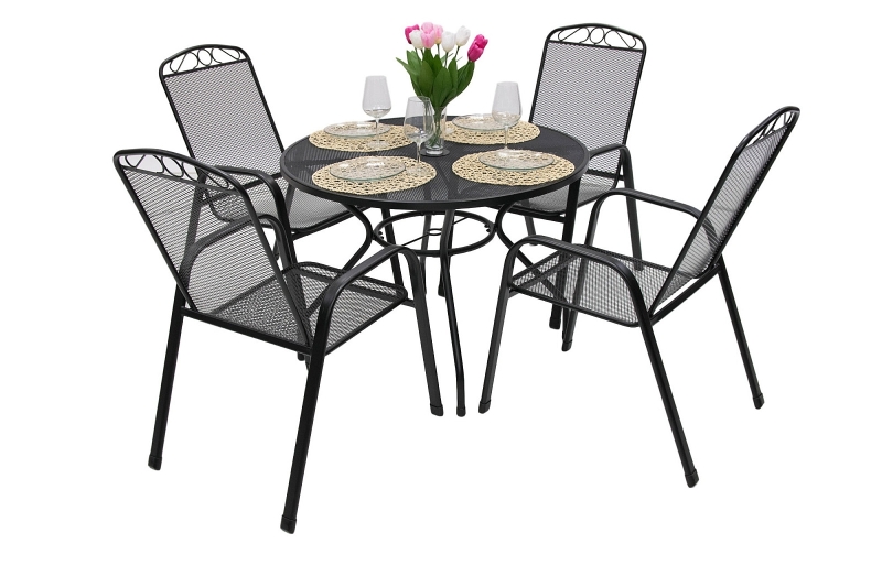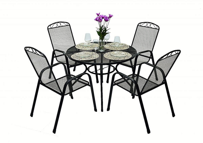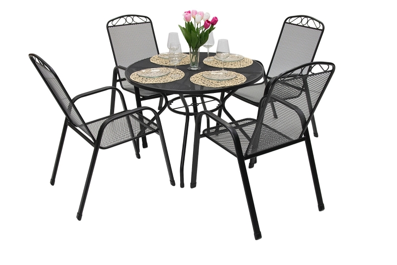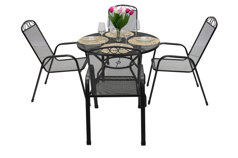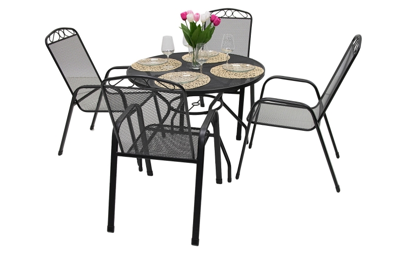Sestava obsahuje: 4x Kovové kreslo GREY (čierna), 1x Kovový stôl TAMPA ø 100 cm (čierna)