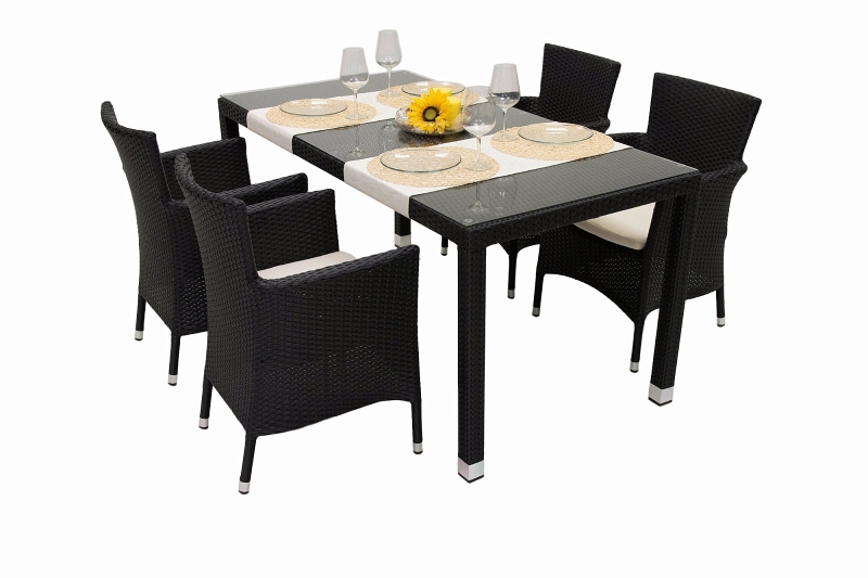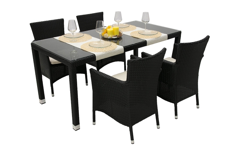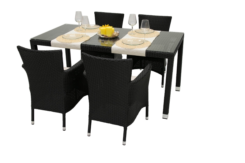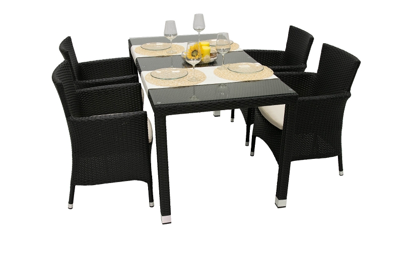 Výhodou je možnosť stohovania kresiel, ktoré je zabezpečené pomocou dvoch otvorov na nohy, ktoré sú šikovne maskované poduškou. Sestava obsahuje: 1x Záhradný ratanový stôl NAPOLI 160x80 cm (čierna), 4x Ratanové kreslo stohovateľné MODENA s poduškou (čierna)