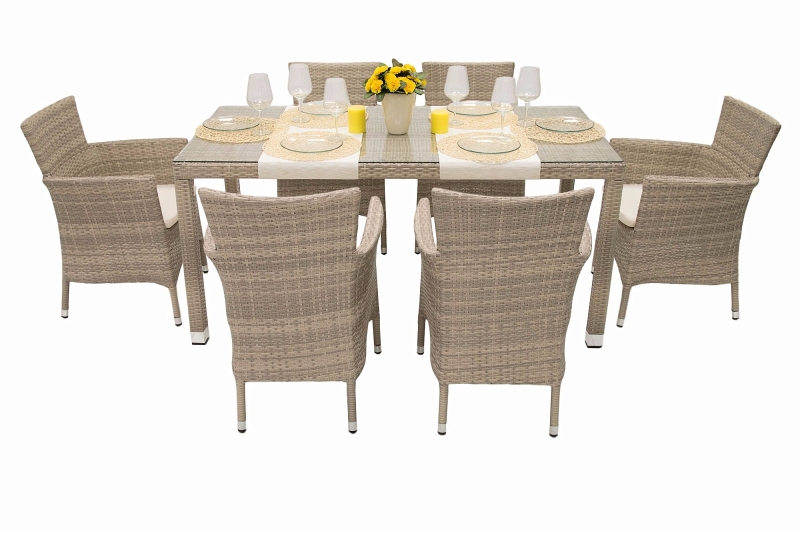 Výhodou je možnosť stohovania kresiel, ktoré je zabezpečené pomocou dvoch otvorov na nohy, ktoré sú šikovne maskované poduškou. Sestava obsahuje: 1x Záhradný ratanový stôl NAPOLI 160x80 cm (sivo-béžová), 6x Ratanové kreslo stohovateľné MODENA s poduškou (sivo-béžová)