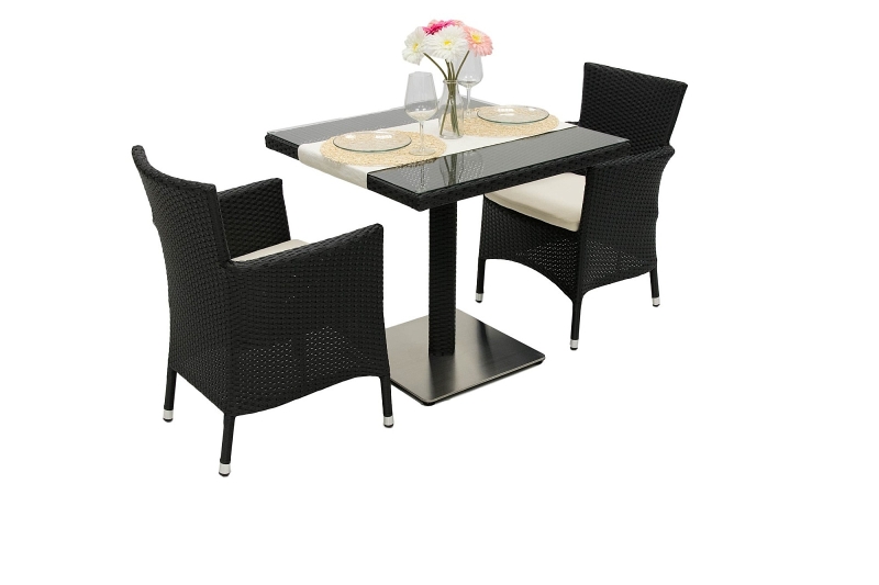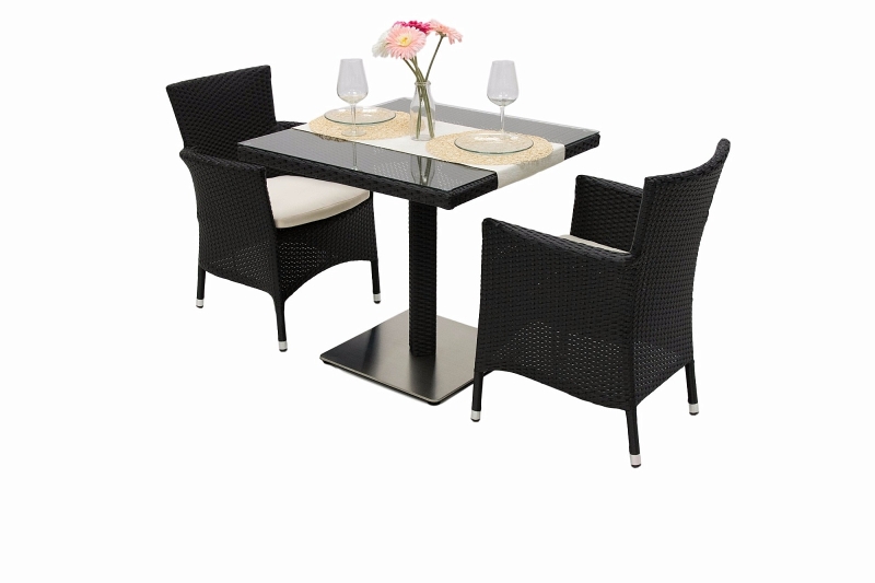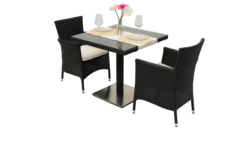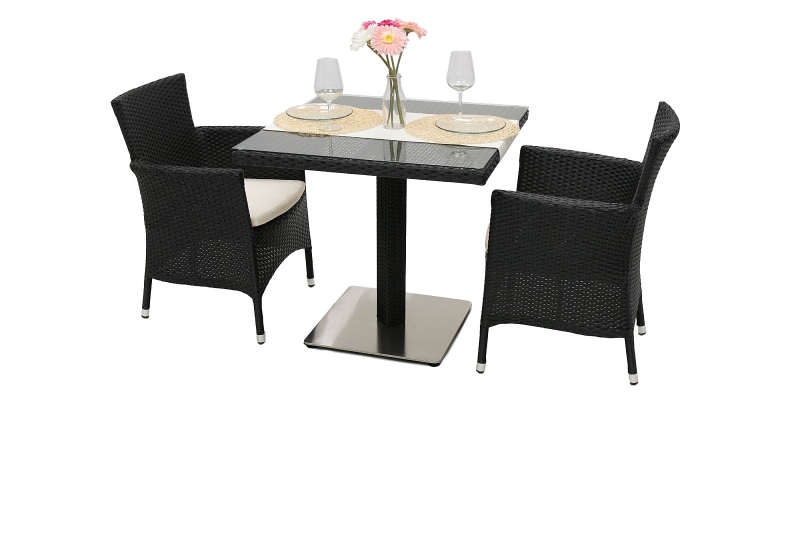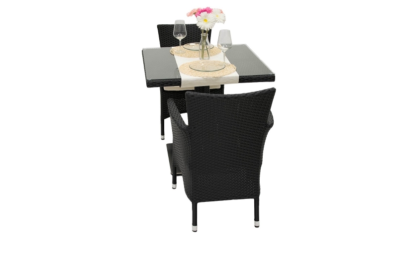 Výhodou je možnosť stohovania kresiel, ktoré je zabezpečené pomocou dvoch otvorov na nohy, ktoré sú šikovne maskované poduškou. Sestava obsahuje: 2x Ratanové kreslo stohovateľné MODENA s poduškou (čierna), 1x Záhradný ratanový stôl GINA 80x80 cm (čierna)