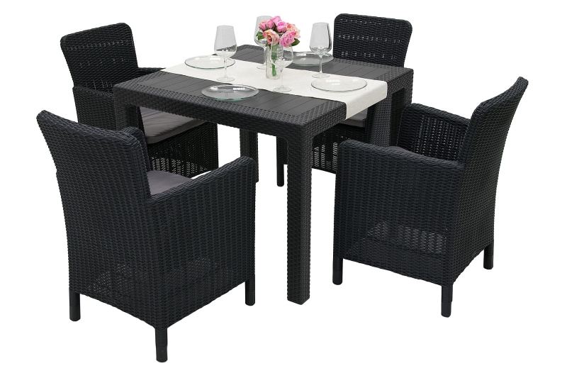 Sestava obsahuje: 4x Záhradné kreslo z umelého ratanu DANTE DINNING (antracit), 1x Záhradný stôl z umelého ratanu MANHATTAN 95x95 cm (antracit)