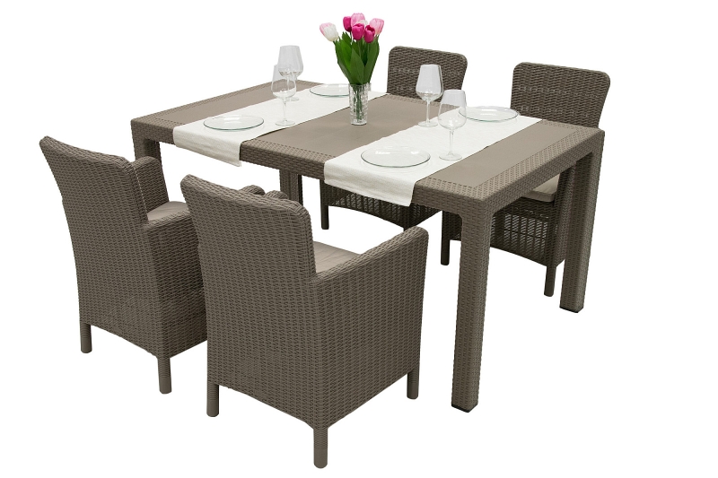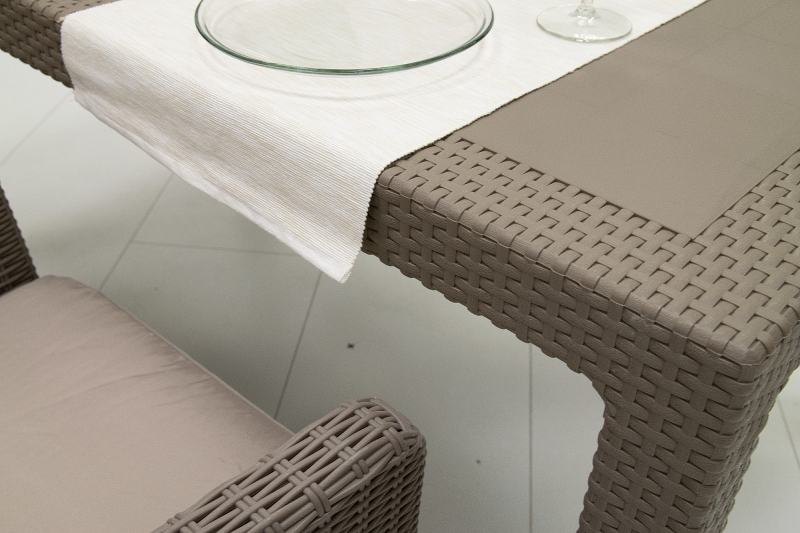 Luxusná ratanová zostava pre chvíle pohody u dobrého jedla a pitia. Odtieň capuccino je veľmi jemný, príjemný na pohľad a v kombinácii s pohodlnými poduškami vytvorí dokonalé záhradné posedenie. Elegantný moderný dizajn podporuje bezúdržbový materiál umelého ratanu z celoplastové konštrukcie, ktorý je veľmi ľahký a odolný voči vode a UV žiareniu. Sestava obsahuje: 4x Záhradné kreslo z umelého ratanu DANTE DINNING (cappuccino), 1x Záhradný stôl z umelého ratanu MANHATTAN 161x95 cm (cappuccino)