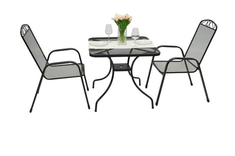 Kovové posedenie Calgary 1 2 sa skladá z dvoch elegantne zaoblených stoličiek s ozdobným kovaním v hornej časti opierky. Stoličku dopĺňa praktický štvorcový stolík o strane 80 cm, ktorý má otvor na slnečník. Posedenie sa hodí všade tam, kde potrebujete ušetriť miesto a kde si chcete vytvoriť štýlový relaxačný kútik s posedením.