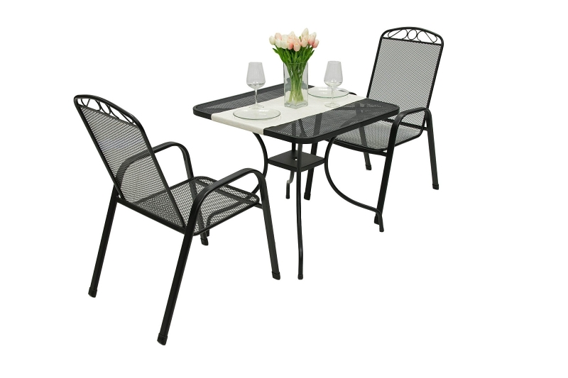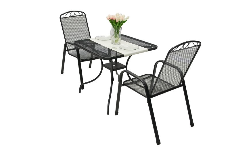 obsahuje dve elegantné a pevné kovové stoličky s vysokou nosnosťou 120 kg,