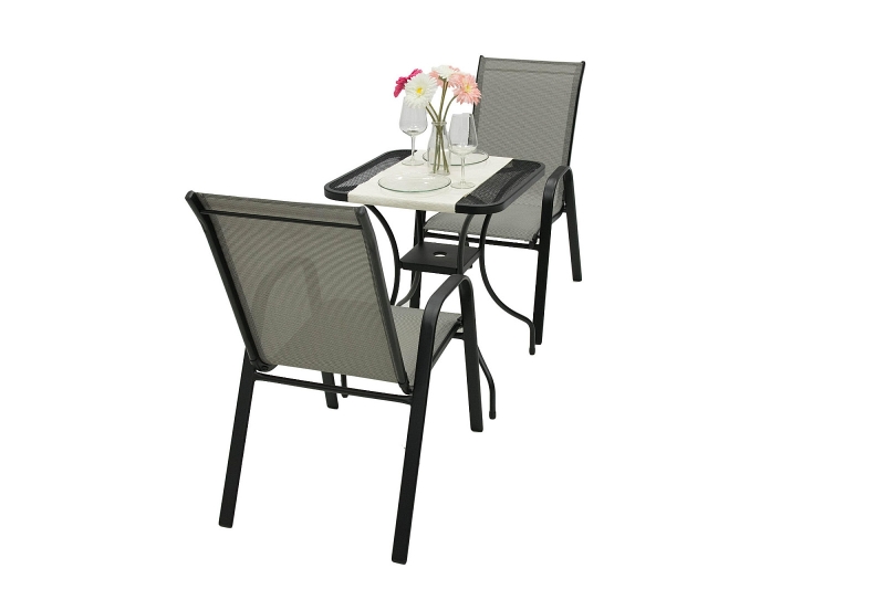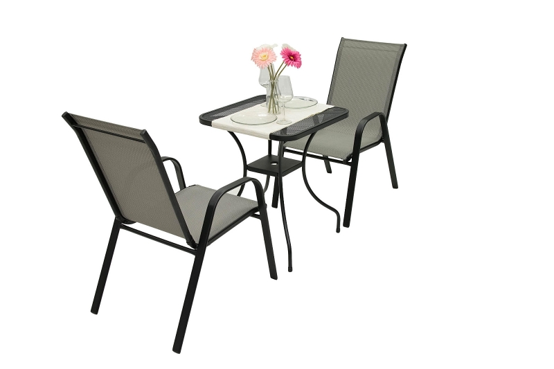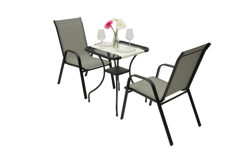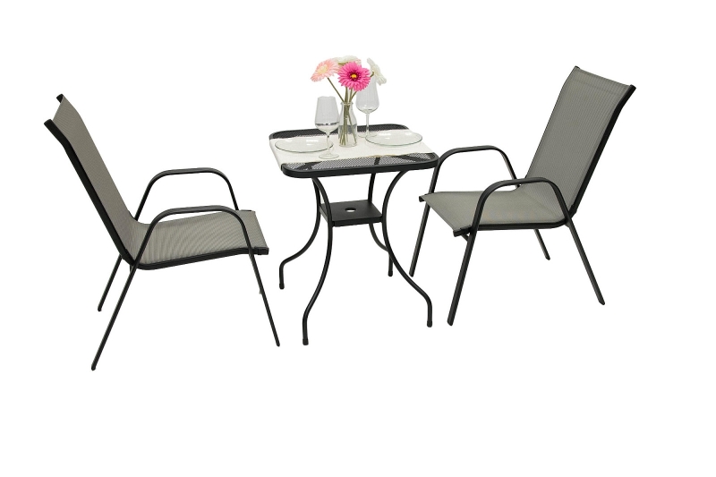 Sestava obsahuje: 1x Kovový stôl MONTREAL 60x60 cm, 2x Záhradné kreslo GLORIA (sivá)