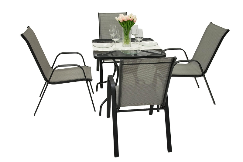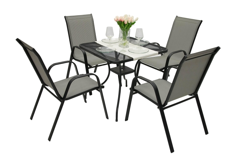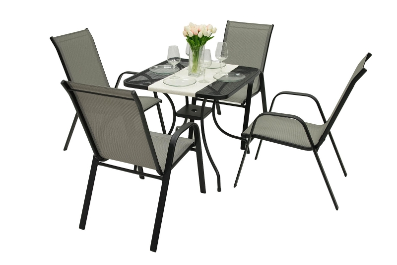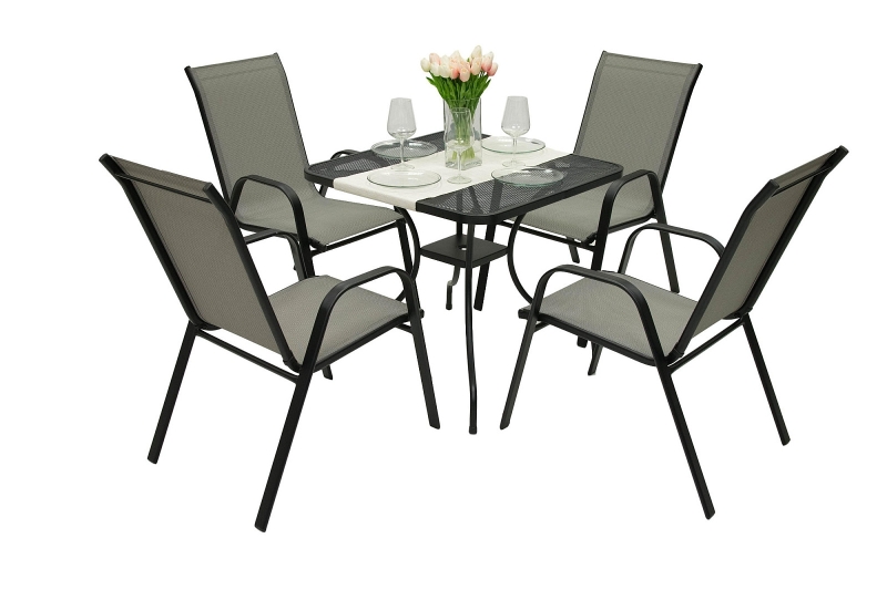 Sestava obsahuje: 1x Kovový stôl MONTREAL 80x80 cm, 4x Záhradné kreslo GLORIA (sivá)