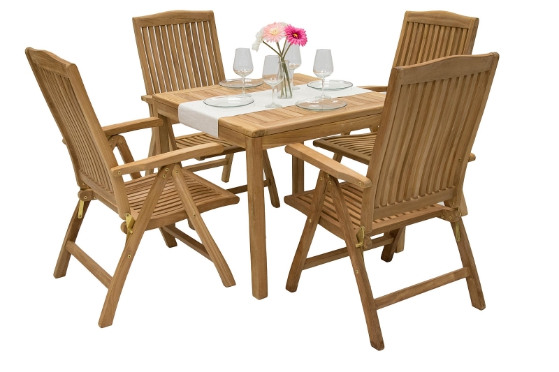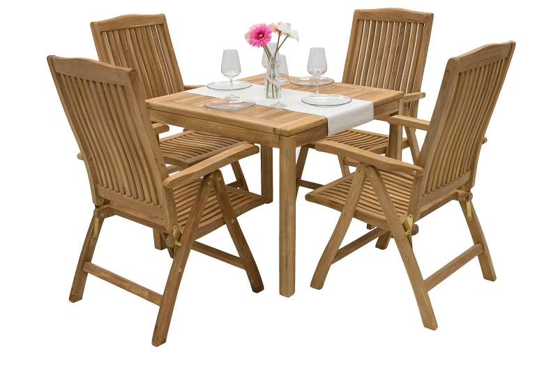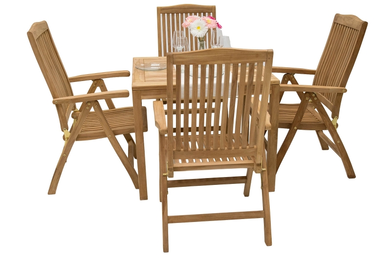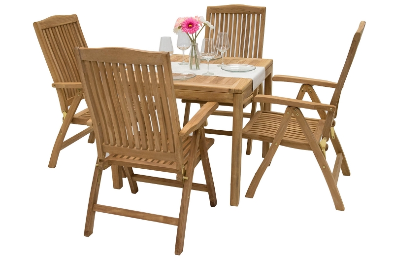 Použitie: interiér, exteriér Sestava obsahuje: 4x Záhradné teakové polohovacie kreslo LAGUNA (teak), 1x Záhradný stôl pevný FLORA 90x90 cm (teak)