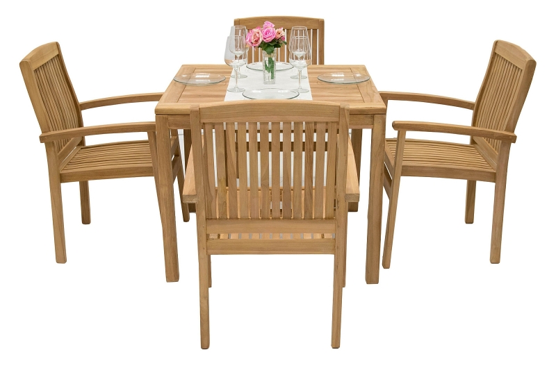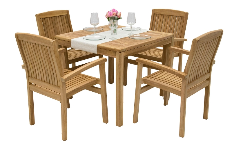 Použitie: interiér, exteriér Sestava obsahuje: 1x Záhradný stôl pevný FLORA 90x90 cm (teak), 4x Záhradné pevné kreslo HARMONY (teak)