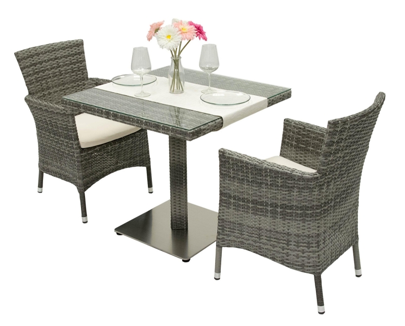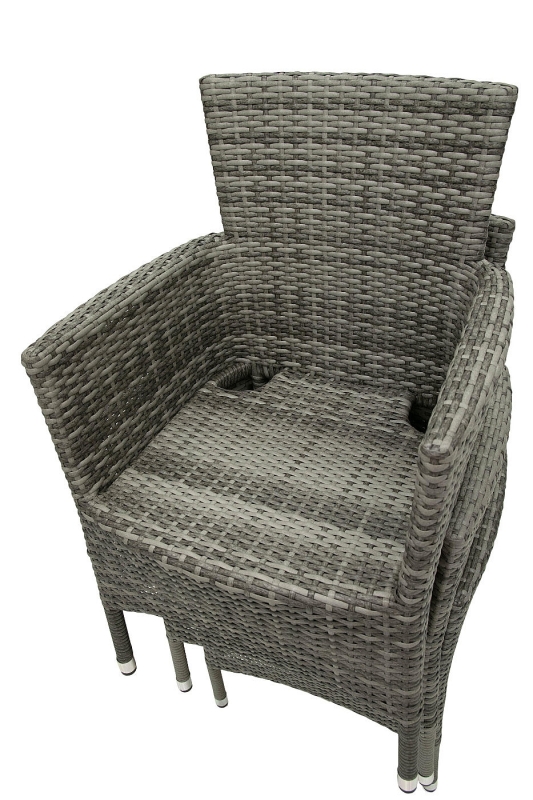 Výhodou je možnosť stohovania kresiel, ktoré je zabezpečené pomocou dvoch otvorov na nohy, ktoré sú šikovne maskované poduškou. Sestava obsahuje: 2x Ratanové kreslo stohovateľné MODENA s poduškou (sivá), 1x Záhradný ratanový stôl GINA 80x80 cm (sivá)