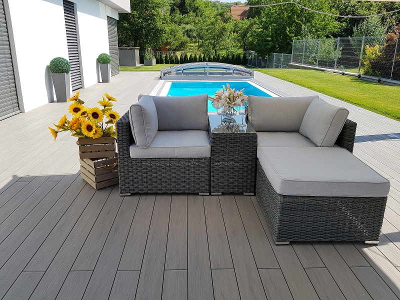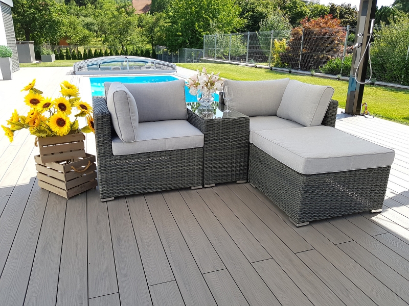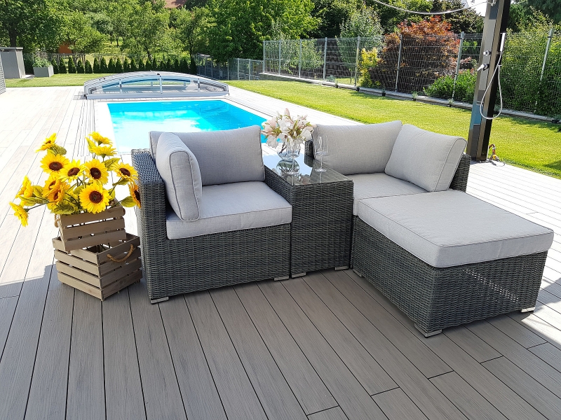Ratanový nábytok z kolekcie modulových setov, ktorý vyniká svojou variabilitou.Zostavte si súpravy podľa Vašich predstáv.Umelý ratan sa pýši svojím nadčasovým dizajnom a takmer nulovú údržbou. Polyetylénové vlákno sa vyznačuje vysokou pružnosťou, pevnosťou a odolnosťou voči vlhkosti i UV žiareniu. Je odolný voči povětrmostním podmienkam a je vhodný na celoročné státie vonku (odporúčame pod zastrešením alebo ochranným obalom v zimných mesiacoch). Umelý ratan je ľahký, takže zaisťuje pohodlnú manimulaci záhradného nábytku po záhrade či terase.Konštrukcia je vyrobená z robustnej hliníkovej konštrukcie, ktorá je zvarená tak, aby zaistila vysokú nosnosť jednotlivých prvkov. Hliník sa vyznačuje vysokou odolnosťou a pevnosťou. Nedochádza ku korózii.Polstrovanie je v sile 10 cm, jedná sa o látku s hustotou 220 g/m2. Lemovanie po krajoch. Penová výplň. Všetky podušky sú vybavené zipsom.