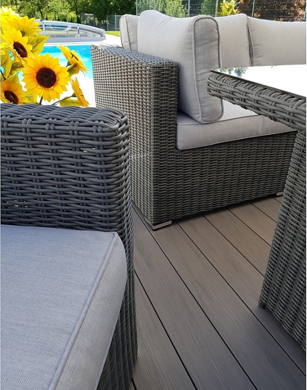 Nastaviteľná rovinnosť pomocou nožičiek. Sestava obsahuje: 2x Ratanový rohový diel SEVILLA (antracit), 1x Ratanový stolek bočný SEVILLA (antracit), 1x Ratanový stolík/taburet SEVILLA (antracit)