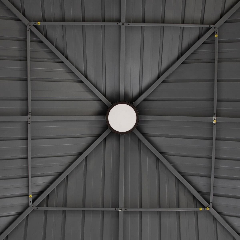 Súčasťou altánku je solárny panel pre napájanie lampy s 82 LED žiarovkami (svietivosť 4 hodiny po 8 hodinách nabíjania) - praktická vychytávka, ktorú oceníte v podvečerných a nočných hodinách. Svetlo bez ťahania elektrickej zásuvky od domu!