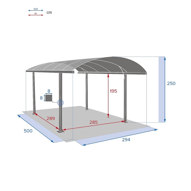 Minimalistický vzhľad prístrešku ladí k domčeku na dedine ik modernej vile. Pod strechu sa pohodlne vojde osobné vozidlo a medzi stĺpiky sa trafíte aj poslepiačky (ale radšej to neskúšajte;). Možno využiť aj ako zastrešenie pre motorku, bicykle, nafukovacie vírivku, alebo na grilovanie v kútiku pred dažďom. Zo zakrivené strechy dobre steká voda.