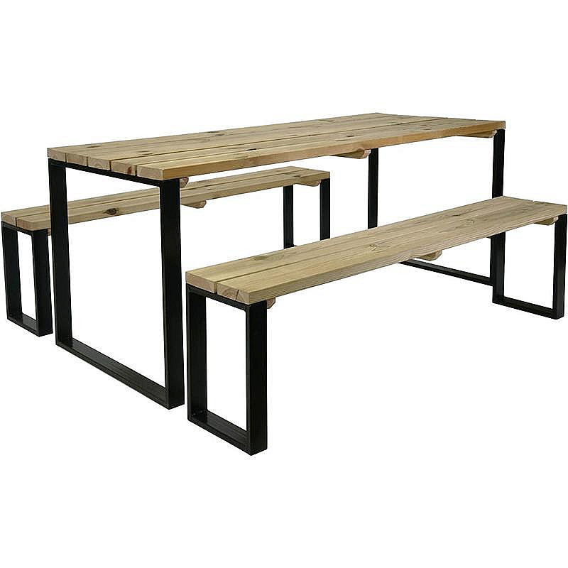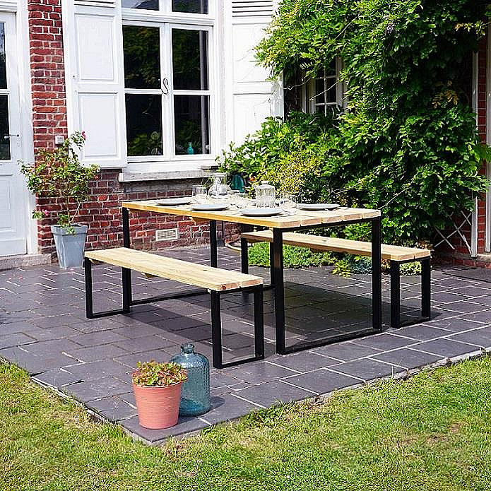 Sada záhradného nábytku kopíruje neopozeraný, moderný dizajn a zároveň spĺňa požiadavky na komfort sedenia. Ak chcete zdieľať svoj čas s rodinou alebo priateľmi v srdci vašej záhrady alebo na terase, je táto zostava tou pravou voľbou. So svojím kovovým podnožím v tvare písmena U a drevenou doskou ťaží táto záhradná zostava z industriálneho štýlu, ktorý sa skvele hodí ku všetkým vonkajším dekoráciám.