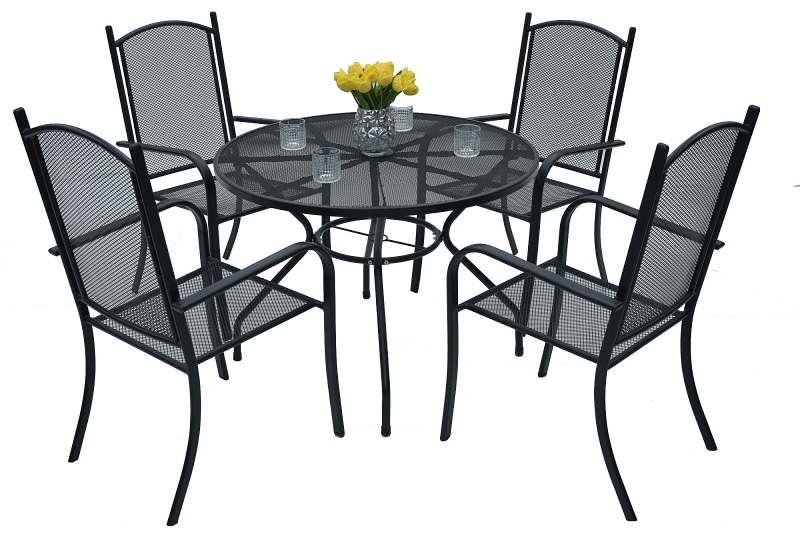 Sestava obsahuje: 4x Kovové kreslo NANCY (čierne), 1x Kovový stôl TAMPA ø 100 cm (čierna)