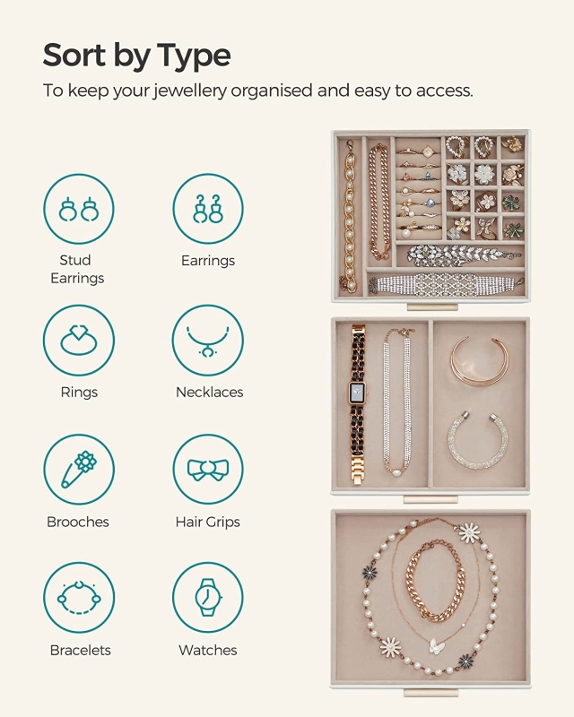 Biela šperkovnica ponúka celkom tri poschodia, horné s pripravenými priehradkami na jednotlivé druhy šperkov, stredné len s jednou priehradkou a posledné bez deliacej priehradky.