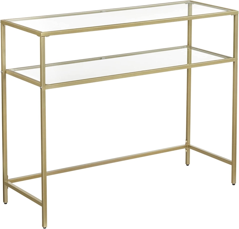 Konzolový stolík VASAGLE je vyrobený z pozláteného kovového rámu a dvoch priehľadných sklenených dosiek.