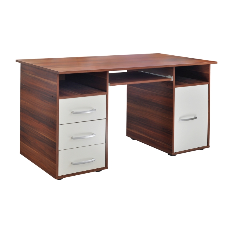 Veľký písací stôl sa bude hodiť do interiéru zariadeného nábytkom vo vyhotovení orech/biela. Písací stôl 60194, vo vyhotovení orech/biela, obsahuje 3 zásuvky a skrinku, v ktorej je variabilná polica. Stôl zapadne do kancelárie, pracovne a študentskej izby, a má možnosť montáže výsuvu na klávesnicu.Písací stôl 60194, vo farebnom vyhotovení orech/biela, sa bude hodiť do každého pracovného kúta, poskytne vám totiž nielen veľkorysú plochu na prácu, ale predovšetkým šikovný úložný priestor. Veľký písací stôl obsahuje tri zásuvky a skrinku s dvierkami, v ktorej sa nachádza variabilná polica. Do zásuviek uložíte najrôznejšie dokumenty aj drobné kancelárske potreby, do skrinky potom uložíte učebnice a knihy. Písací stôl vo farebnom vyhotovení orech/biela najlepšie zapadne do kancelárie, pracovne a študentskej izby zariadenej práve nábytkom vo vyhotovení orech/biela. Stôl má možnosť montáže výsuvu pre klávesnicu, ktorý je súčasťou stola. Pracujte za veľkým písacím stolom a majte všetko poruke, práca a učenie potom bude radosť.