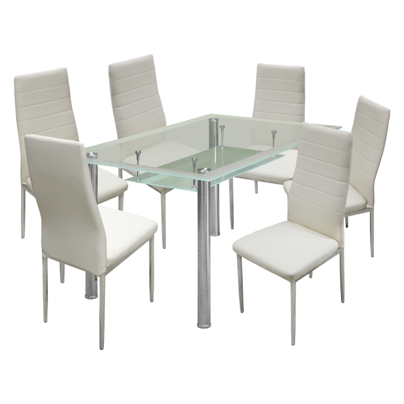 Jedálenská súprava VENEZIA 4413 sa skladá z jedálenského stola VENEZIA 3007 a 6 jedálenských stoličiek MILÁNO 3009. Stôl, v kombinácii kov/tvrdené sklo, chrómované nohy, stoličky biely poťah z imitácie kože a chrómované nohy, výška sedu 46 cm. Rozmer stola 150 × 90 × 76 cm, stoličky 41 × 40 × 98 cm.Jedálenská súprava VENEZIA 4413 bude vyzerať luxusne v každej jedálni a poskytne priestor na stolovanie ako početnej rodine, tak návšteve. Jedálenská súprava VENEZIA 4413 sa skladá z jedálenského stola VENEZIA 3007 a šiestich jedálenských stoličiek MILÁNO 3009. Jedálenský stôl je v kombinácii kov/tvrdené sklo, sklenená doska stola má matné okraje a priestrannú policu. Jedálenský stôl má pevné chrómované nohy, jedálenské stoličky majú poťah z imitácie kože vo farebnom vyhotovení biely. Jedálenské stoličky majú tiež kovové chrómované nohy, výška sedu 46 cm. Jedálenské stoličky majú vyššiu chrbtovú opierku a hladké sedadlo, takže sa vám na nich bude príjemne odpočívať a stolovať. Rozmer stola 150 × 90 × 76 cm, rozmer stoličky 41 × 40 × 98 cm.