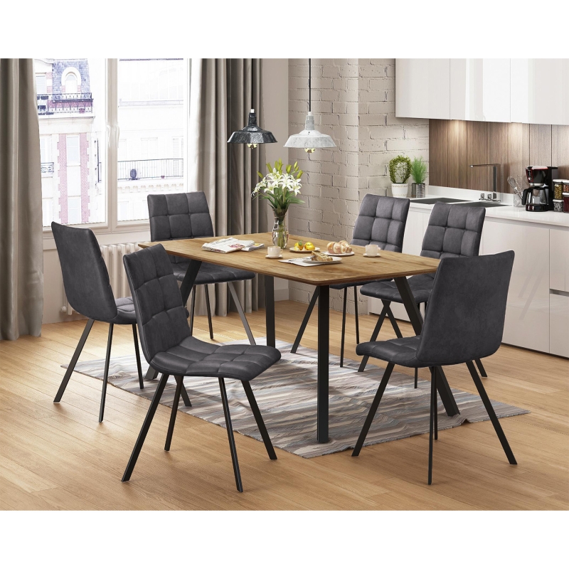 Jedálenský stôl BERGEN dub + 6 stoličiek BERGEN sivé mikrovlákno oživia jedálenský kút. Stôl BERGEN má kovovú čiernu konštrukciu a dosku MDF, dub Wotan, 140 × 80 × 75 cm. Stoličky majú čiernu kovovú konštrukciu a poťah z imitácie brúsenej kože, mikrovlákno, výška sedu 51 cm, rozmer 55 × 45 × 88 cm.Jedálenský stôl BERGEN dub + 6 stoličiek BERGEN sivé mikrovlákno sú moderným variantom pre váš jedálenský kút. Jedálenský stôl BERGEN 4090 má kovovú konštrukciu vo farebnom vyhotovení čiernu a dosku MDF vo farebnom vyhotovení dub Wotan. Jedálenské stoličky BERGEN 4094 majú tiež kovovú konštrukciu vo farebnom vyhotovení čiernu a poťah z imitácie brúsenej kože, mikrovlákno vo farebnom vyhotovení sivé. Výška sedu stoličky je 51 cm, rozmer 55 × 45 × 88 cm, rozmer stola 140 × 80 × 75 cm. Jedálenské stoličky BERGEN s príjemným sivým poťahom budú vyzerať skvele v moderne zariadenej jedálni a spolu s jedálenským stolom BERGEN vytvoria dokonalé miesto na oddych i stolovanie.