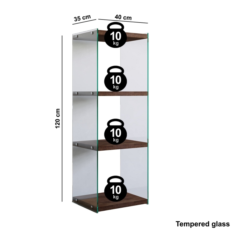 Knižnica je vyrobená z tvrdeného skla a 8 mm hrubého borovicového dreva.