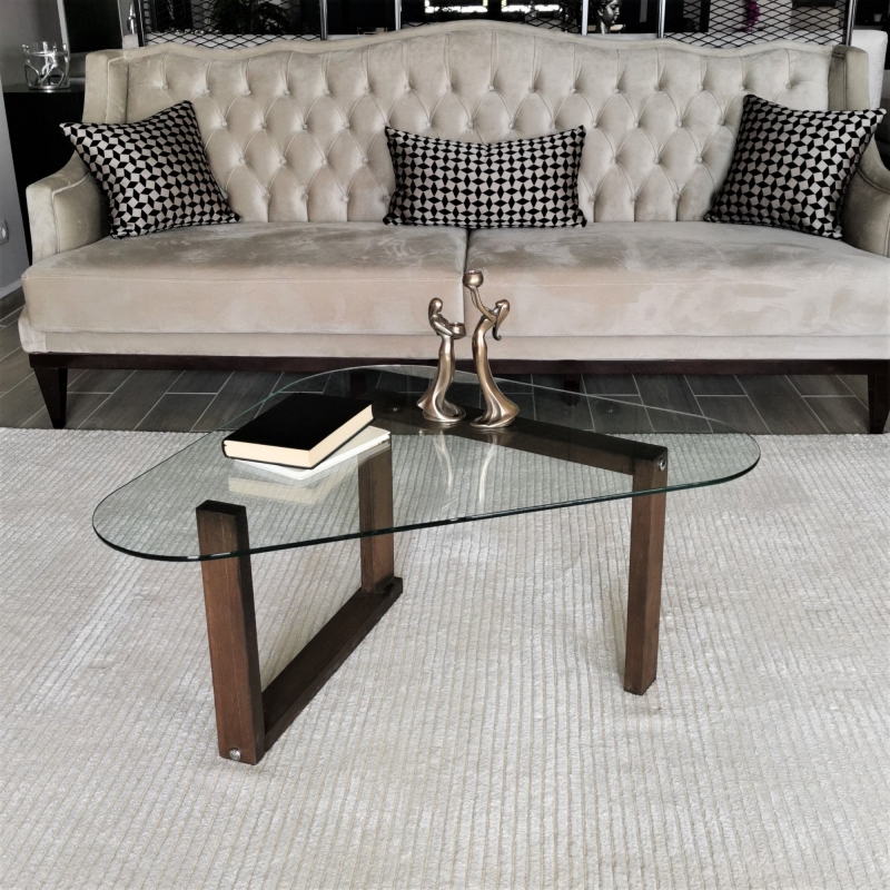 Elegantný sklenený konferenčný stolík, v tvare trojuholníka CAMORTA nie je len plochou na odkladanie drobností.