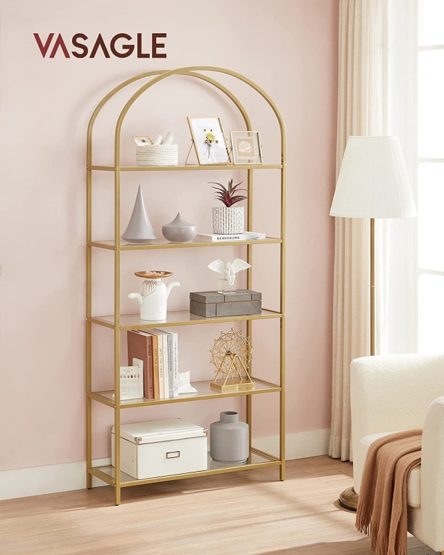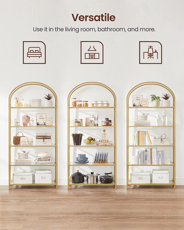 Päťpolicový regál s kovovým rámom zlatej farby ponúka mnohé úložné a odkladacie plochy, ktoré pomôžu udržiavať poriadok v akejkoľvek miestnosti.