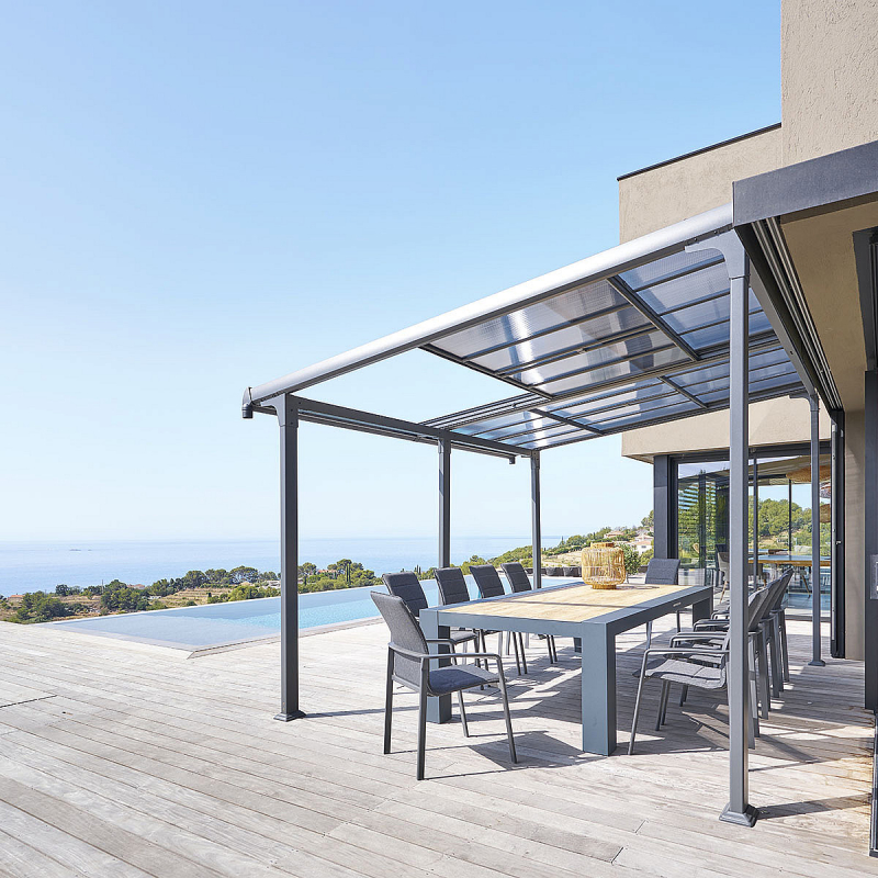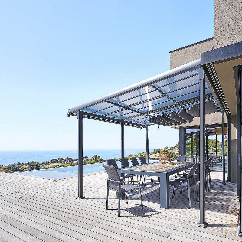 Výsuvná pergola CASABLANCA ponúka veľkorysý priestor ideálny na veľké posedenie.