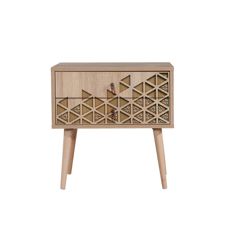 Nočný stolík TWO vás zujme svojim zdobením na zásuvkách a povrazovými úchytmi.