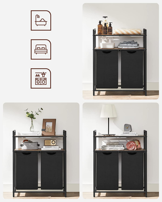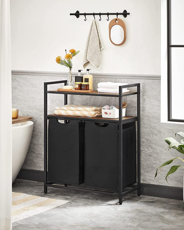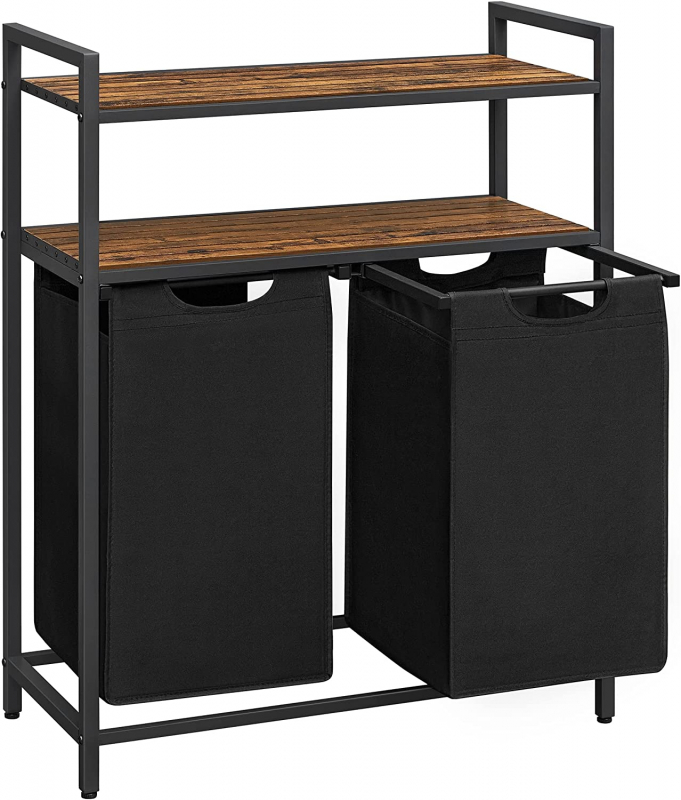 Kôš na bielizeň je vyrobený z čierneho kovového rámu, ktorý nesie nielen dve textilné vyberateľné vrecká, ale aj dva úložné priestory v rustikálnej hnedej farbe.