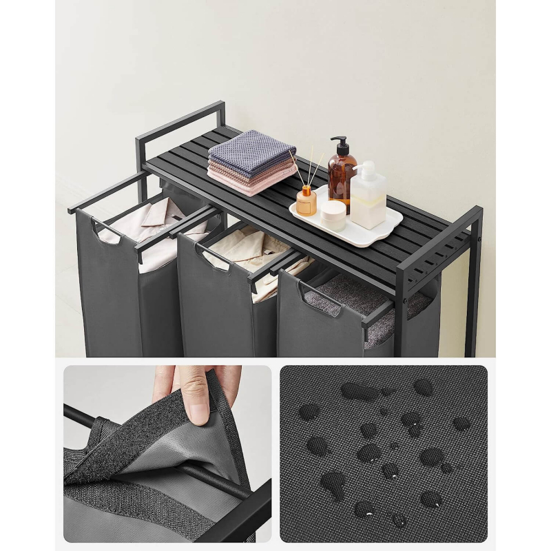 Kôš na bielizeň je vyrobený z pevných oceľových rúrok s rozmermi 2 x 2 cm a vysoko kvalitných dosiek MDF, čo mu dodáva robustnosť a odolnosť (polica unesie až 20 kg). Vrecia sú vyrobené z vodeodolnej tkaniny Oxford. Stabilitu zaisťujú štyri nastaviteľné nožičky.