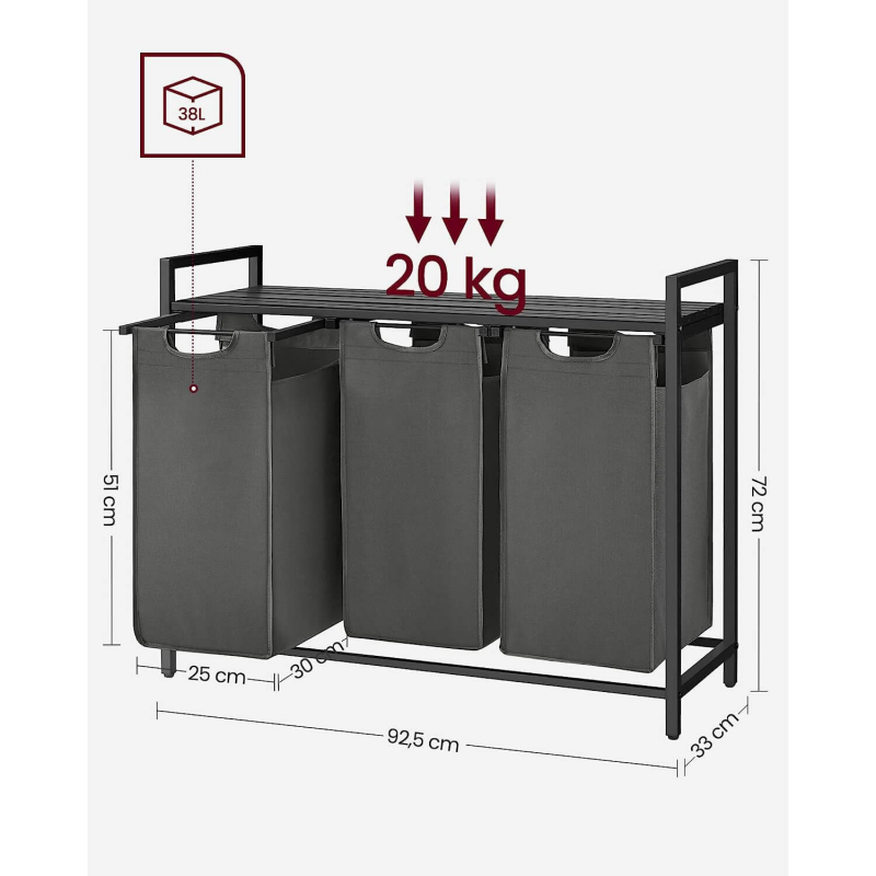 Celková kapacita koša na bielizeň je 114 litrov, čo znamená, že každá z troch komôr pojme 38 litrov bielizne. Vďaka trom oddeleným komorám môžete bielizeň uložiť oddelene podľa farieb alebo druhov, čo uľahčí triedenie pri praní.