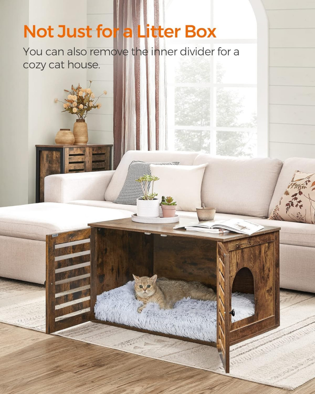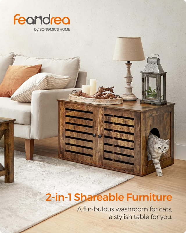 Táto skrinka je skutočne multifunkčná! Môžete ju používať ako skrytý box na mačacie stelivo alebo ako praktický odkladací stolík. Umiestnite do nej zásobník na podstielku a na plochú vrchnú dosku (s nosnosťou do 60 kg) umiestnite knihy alebo dekoratívne predmety. Táto skrinka je jednoducho kus nábytku na mnoho účelov.