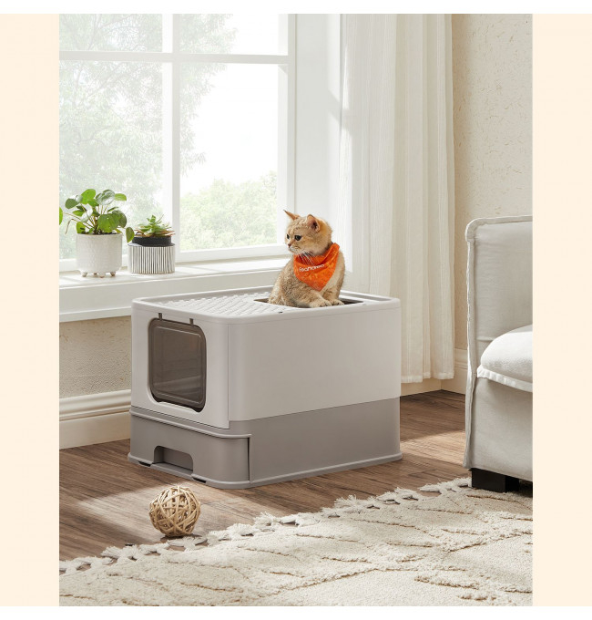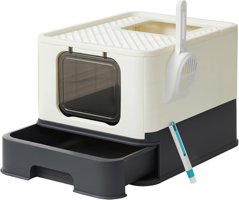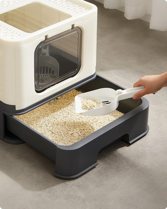 Krytý box na podstielku pre mačky s výsuvnou vaničkou uľahčuje čistenie alebo výmenu podstielky. Súčasťou balenia je lopatka a kefka, ktoré pomáhajú zbierať odpad a čistiť podstielku na vrchu alebo v rohoch.