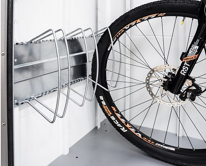 Stojan BIOHORT s prestaviteľnými strmeňovými svorkami. Základová doska je zavesená na dvoch regálových stojnách. Rýchla a jednoduchá fixácia kolies. Miesta pre 3 kolá.