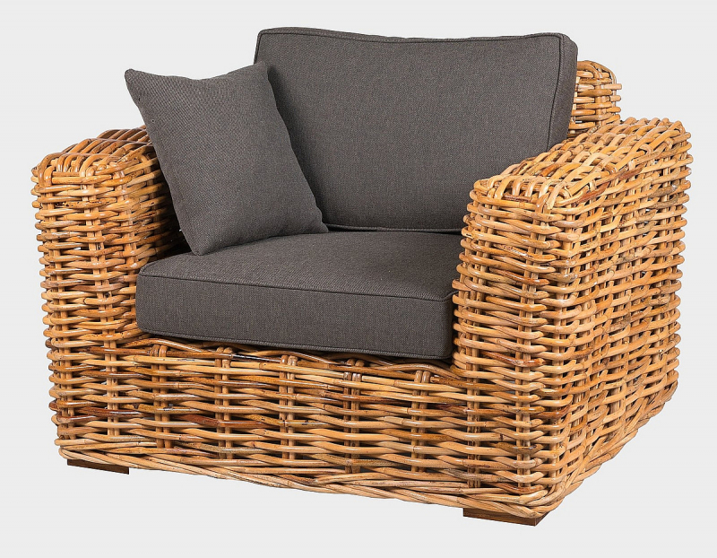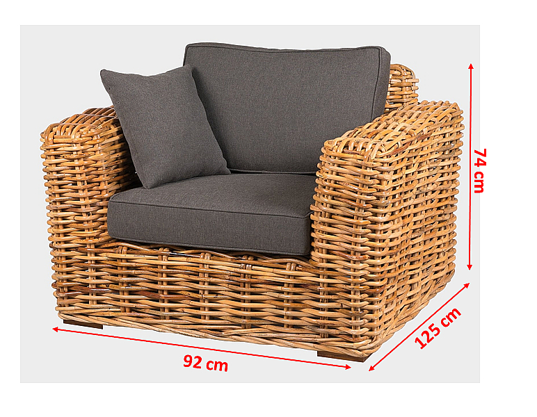 Kreslo 125x92x74cm z prírodného silného ratanu mandola. Konštrukcia je vyrobená z pevnostného 30 mm ratanu. Čalúnenie je vyrobené z veľmi kvalitnej vodeodolnej poťahovej látky SUN UMBRELLA. Ratan je odolný voči poveternostným podmienkam aj mrazu. Na priamom slnku a daždi dochádza k šednutiu nábytku.