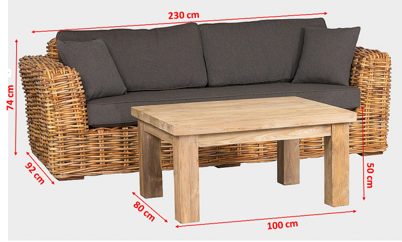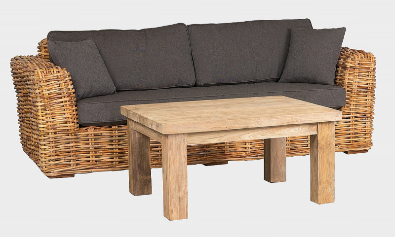 Luxusná ratanová pohovka 230x92x74 cm z prírodného silného ratanu mandola a konferenčný stôl 80x100x50cm z recyklovaného teaku. Konštrukcia pohovky je vyrobená z pevnostného 30 mm ratanu.