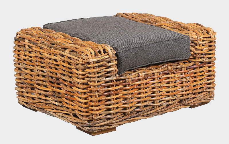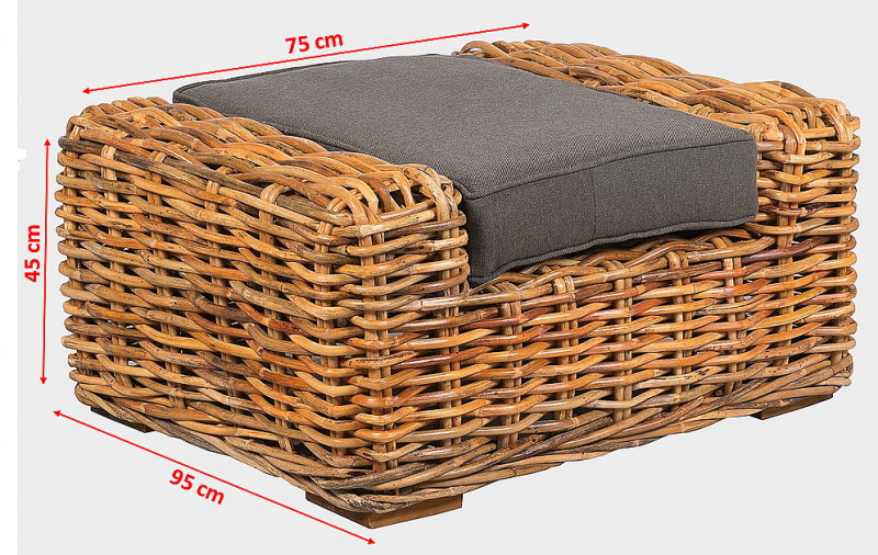 Ratanový taburet BALI s výpletom z prírodného 15 mm hrubého ratanu mandola. Rozmer taburetu 95 x 75x 45 cm. Konštrukcia je vyrobená z pevnostného 30 mm ratanu. Nohy taburetu sú z teaku. Čalúnenie je vyrobené z veľmi kvalitnej vodeodolnej poťahovej látky SUN UMBRELLA. Ratan je odolný voči poveternostným podmienkam aj mrazu. Na priamom slnku a daždi dochádza k šednutiu nábytku.