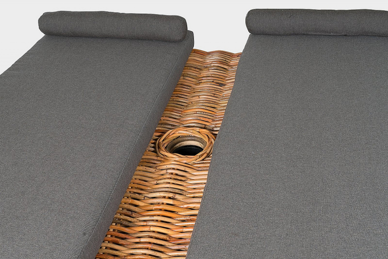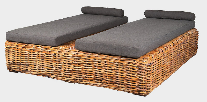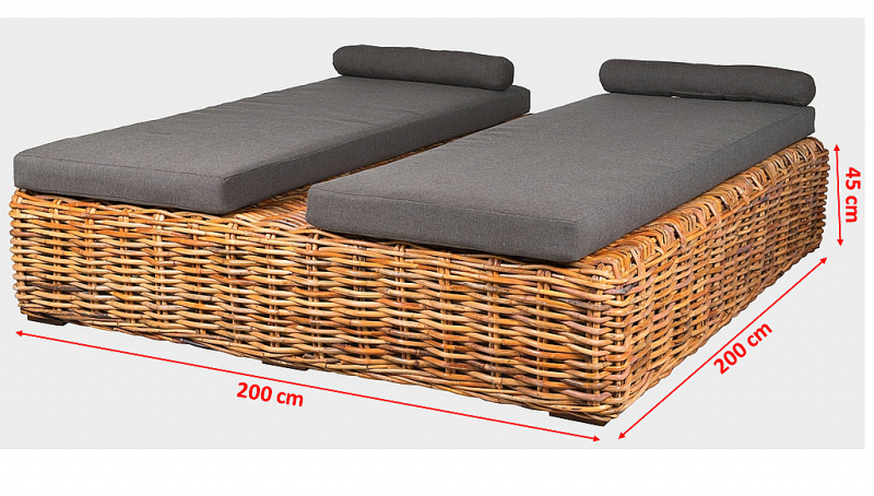 Luxusná ratanová posteľ BOREA s výpletom z prírodného 15 mm hrubého ratanu mandola. Konštrukcia postele je vyrobená z pevnostného 30 mm ratanu. 2x matrac o veľkosti 200x80x11 cm, 2x vankúšik so suchým zipsom. Kombinácia výpletu a konštrukcie z ratanu zaisťuje nášmu výrobku pevnosť a pružnosť. Čalúnenie je vyrobené z veľmi kvalitnej vodeodolnej poťahovej látky SUN UMBRELLA. Otvor o veľkosti 12 cm na prípadné umiestnenie slnečníka. Nohy postele sú vyrobené z teaku. Na priamom slnku a daždi dochádza k šednutiu nábytku.