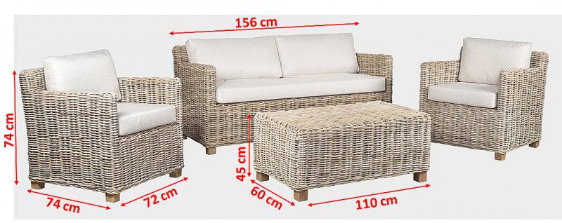 Výška celkom: 740, Obsahuje: 2x kreslo, sofa, stôl so sklom, Rozmer stola: 1100 x 450 x 600, Rozmer kreslá / stoličky: 740 x 740 x 720, Rozmer 2-miestne lavice / pohovky: 1560 x 740 x 720, Polstrovanie: áno