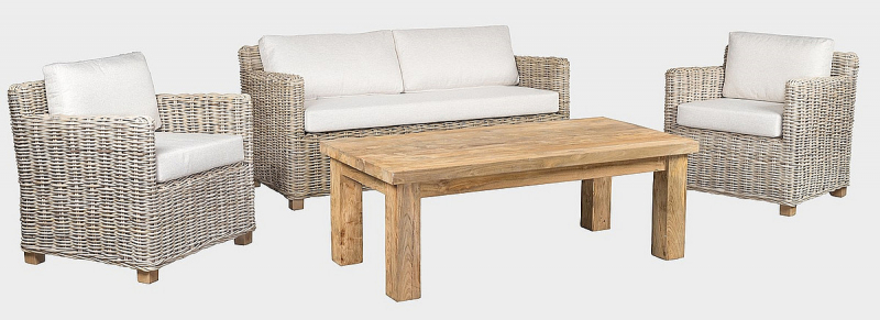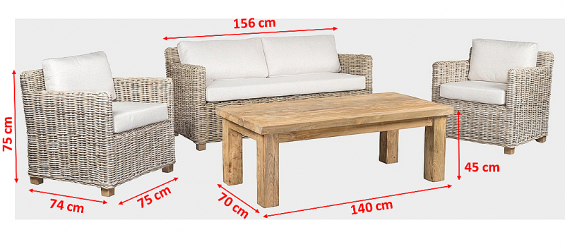 Záhradná ratanová zostava MIRABELLA z prírodného brúseného ratanu cubu. Set sa skladá: 2x kreslo (74x74x72cm) 1x sofa (156x74x72cm) 1x stôl BOB z recyklovaného teaku 140x70x45cm Brúsený ratan je ponechaný v prírodnom stave. Ratan cubu sa vyznačuje vysokou pevnosťou a odolnosťou. Na dotyk pôsobí veľmi príjemne. Ratan je bezúdržbový a veľmi odolný voči poveternostným podmienkam. Súčasťou je aj kvalitné pohodlné polstrovanie. Sestava obsahuje: 1x Záhradné ratanové kreslo MIRABELLA
