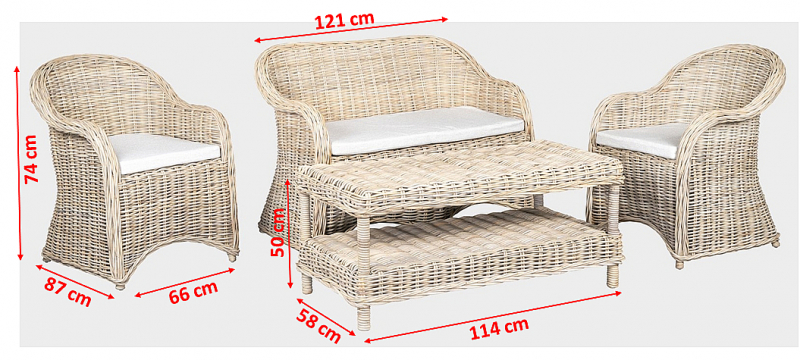 Výška celkom: 740, Obsahuje: 2x kreslo, sofa, stolík, Rozmer stola: 1140 x 580 x 500, Rozmer kreslá / stoličky: 660 x 740 x 870, Rozmer 2-miestne lavice / pohovky: 1210 x 740 x 870, Polstrovanie: áno